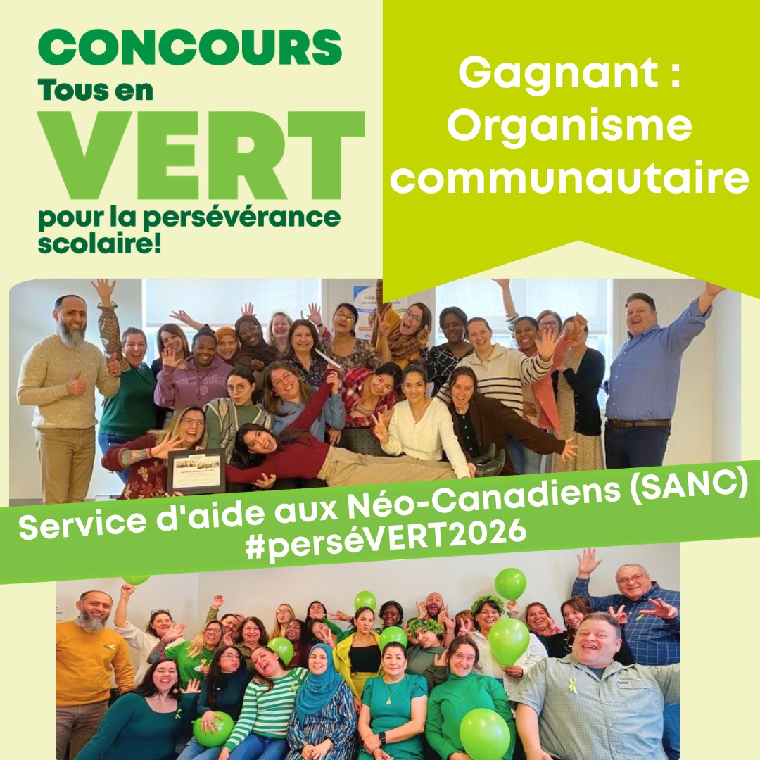 Le SANC est fier d’avoir remporté le prix de la catégorie Organisme communautaire dans le cadre du concours Tous en VERT pour la persévérance scolaire, organisé par R3USSIR lors du Jeudi PerséVERT et des Journées de la persévérance scolaire en Estrie.